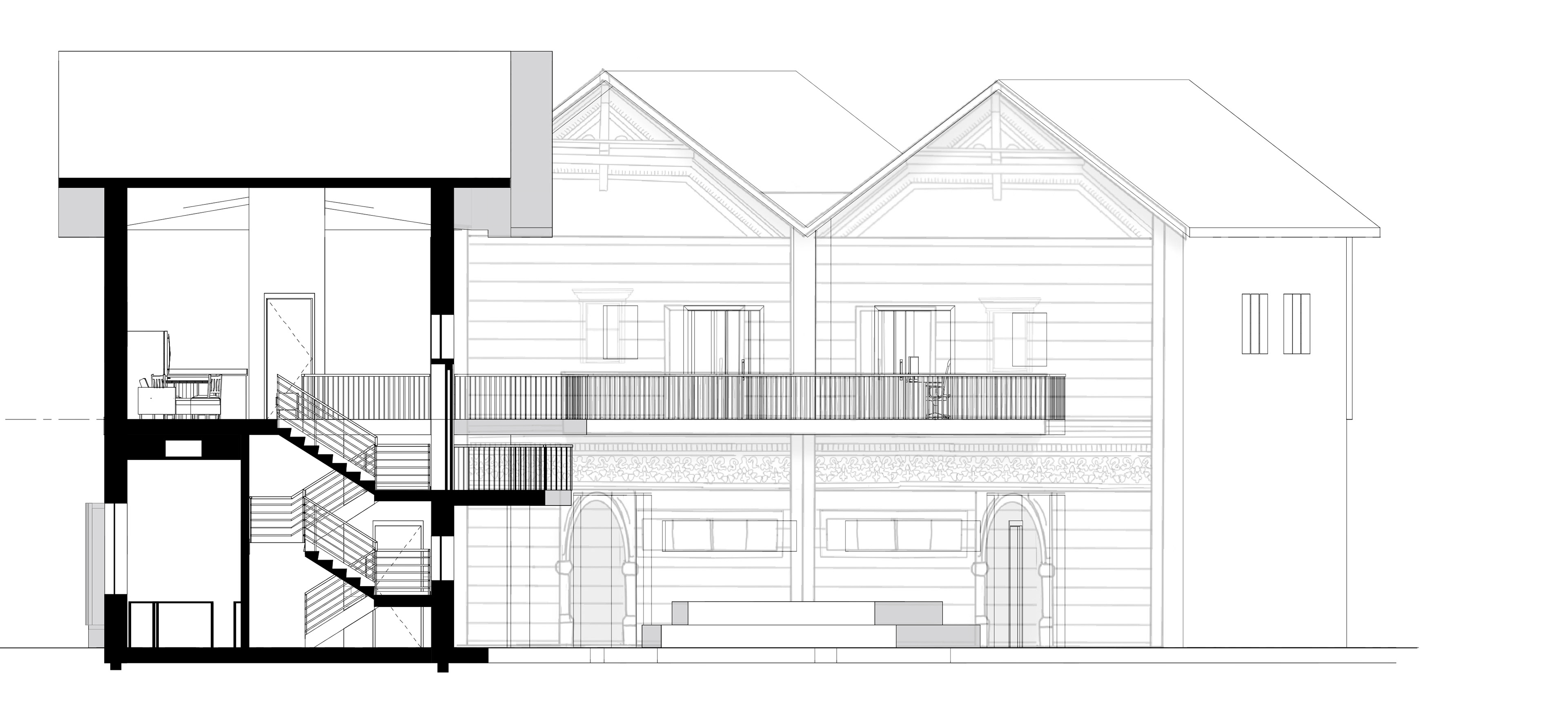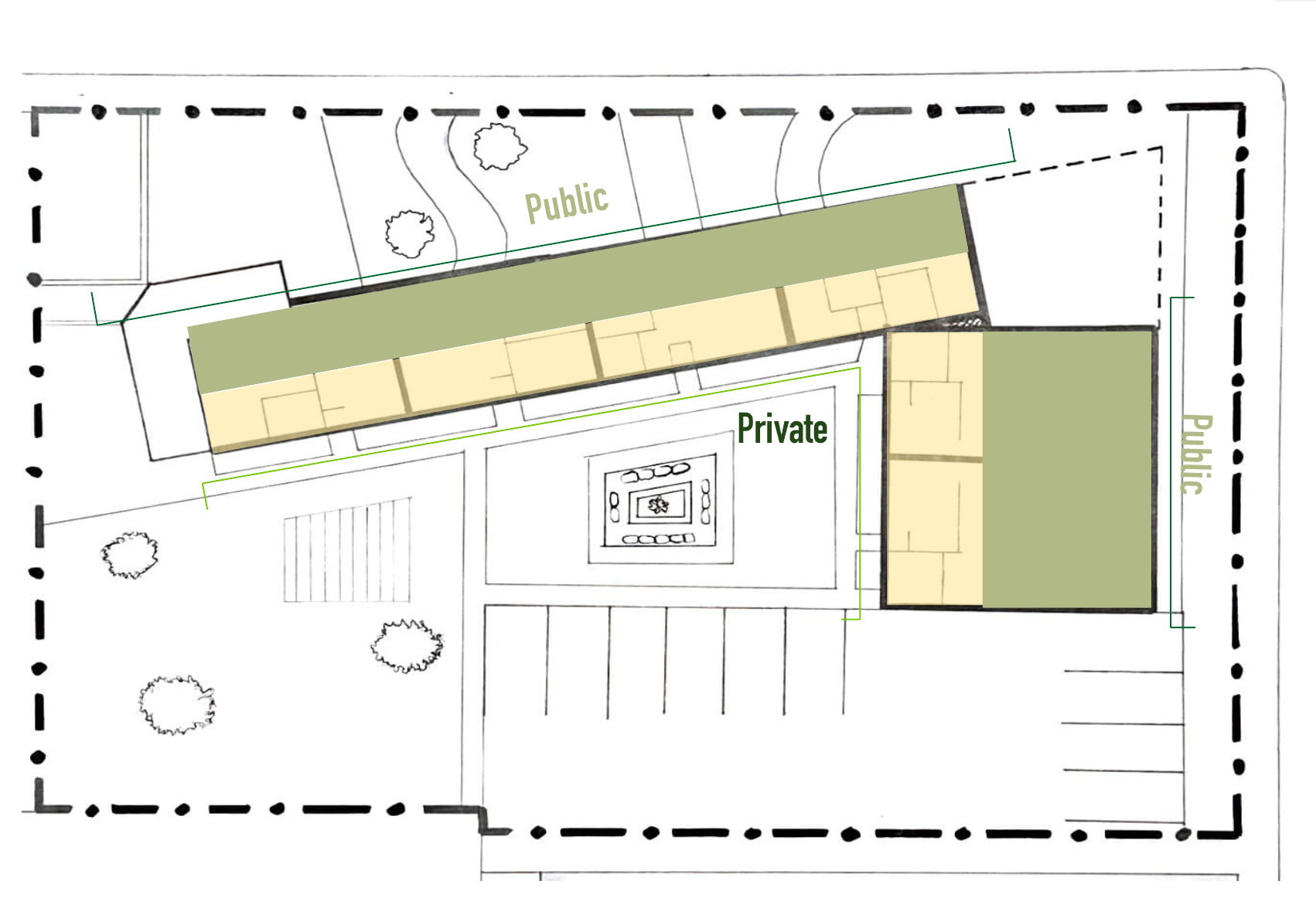 Programming required each unit to have access to a private outdoor space. Due to the decision to have connecting units, the solution for focusing on the goal statement of private spaces in private areas was to step the interior facades and add a mezzanine level at every other unit's stair landing. This allowed both interaction between balconies, but also provided separation rather than one connected balcony level across the entire facade, as seen on the Eddy St balconies. Due to the Eddy St housing the larger units, the difference in balcony type felt more intentional, and a partition wall exists to draw upon the stepping of the Corson Ave facade.
