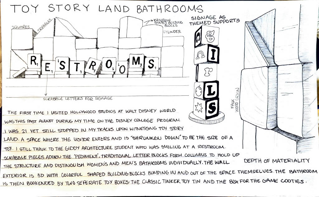 Abstract: This research project seeks to affirm the value of themed design within the growing landscape of immersive consumer experiences, emphasizing the critical role of integrative storytelling and entertainment in built environments. Further inspired by the Disney College Program: particularly with planning that captures memorable, immersive moments in the parks. This project is driven by a fascination with storytelling through design rich in detail and narrative. These environments invite viewers to explore how space can convey a compelling story. One of the central goals of this research is to challenge and dispel the stigma that often surrounds themed entertainment as being “less-than” traditional architectural or design disciplines. Themed design requires meticulous attention to detail, creativity, and imagination; qualities that transform physical spaces into narrative-driven experiences. Despite its importance, this niche area of design is frequently misunderstood and undervalued. This study will explore the foundational role of themed design in hospitality and consumer spaces, particularly as the demand for immersive environments continues to rise. Also highlighting the subtle, often overlooked elements that contribute to the success of themed spaces, demonstrating how even the smallest details can significantly impact the way a story is perceived and felt. The inspiration for this project stems from personal experience with the Disney College Program, the influence of the Themed Entertainment Association, and insights gained from Bob Weis’s Dream Chasing.